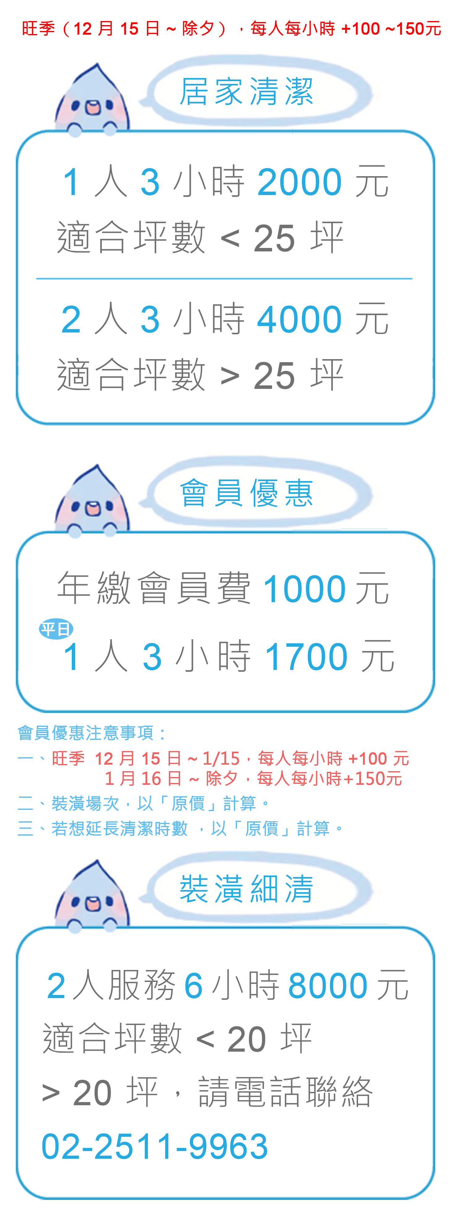 2 人服務 8 小時 9600 元 適合坪數 < 30坪 > 30坪,請電話聯絡 (02-2511-9963) |